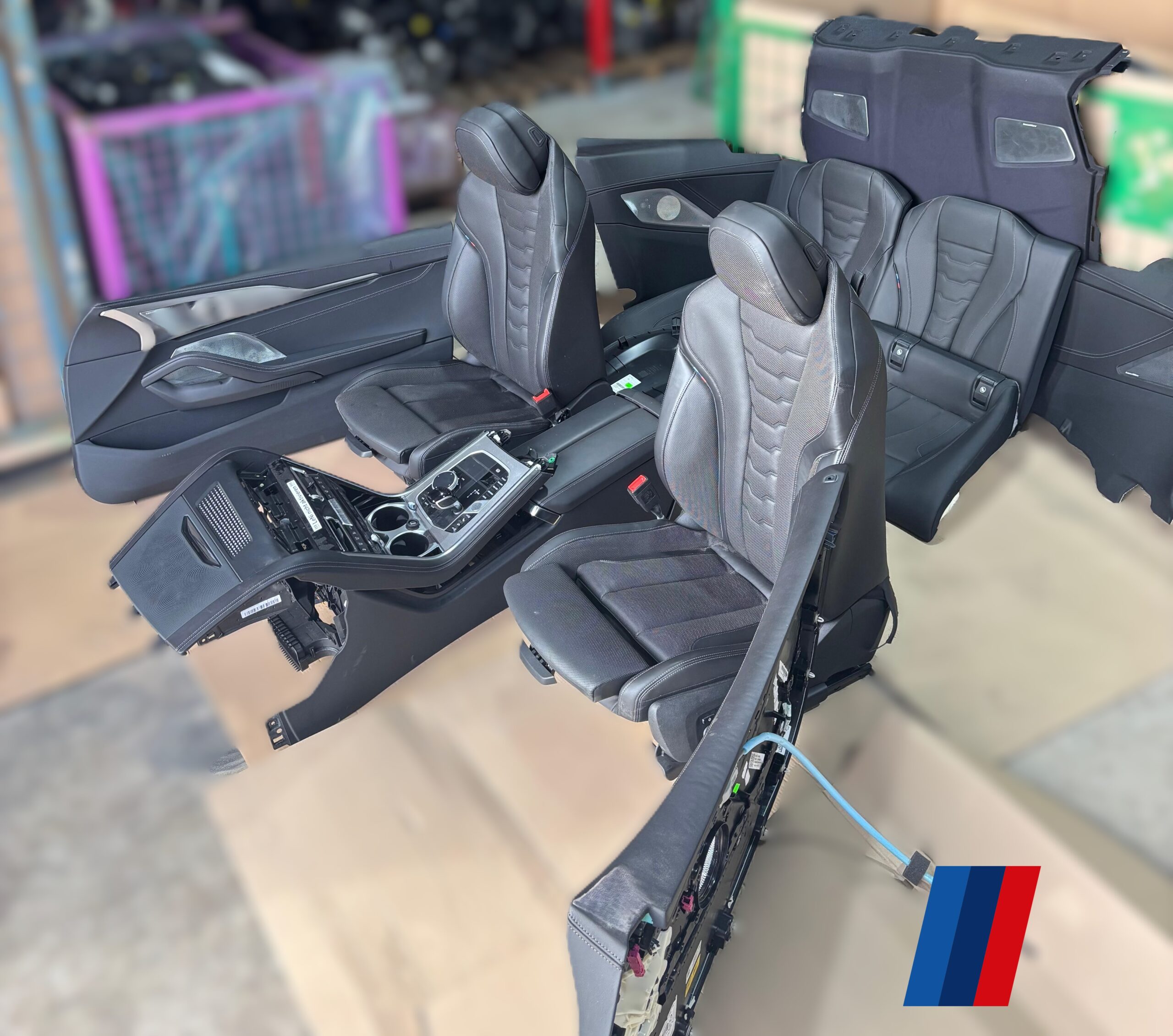 Se oferă spre vânzare un set interior complet, original, demontat de pe un exclusivist BMW M850i xDrive (G15), varianta Coupé cu 2 uși. Acest interior M Sport de înaltă performanță este finisat în tapițerie premium Piele integrală ‘Merino’ Negru (Black).