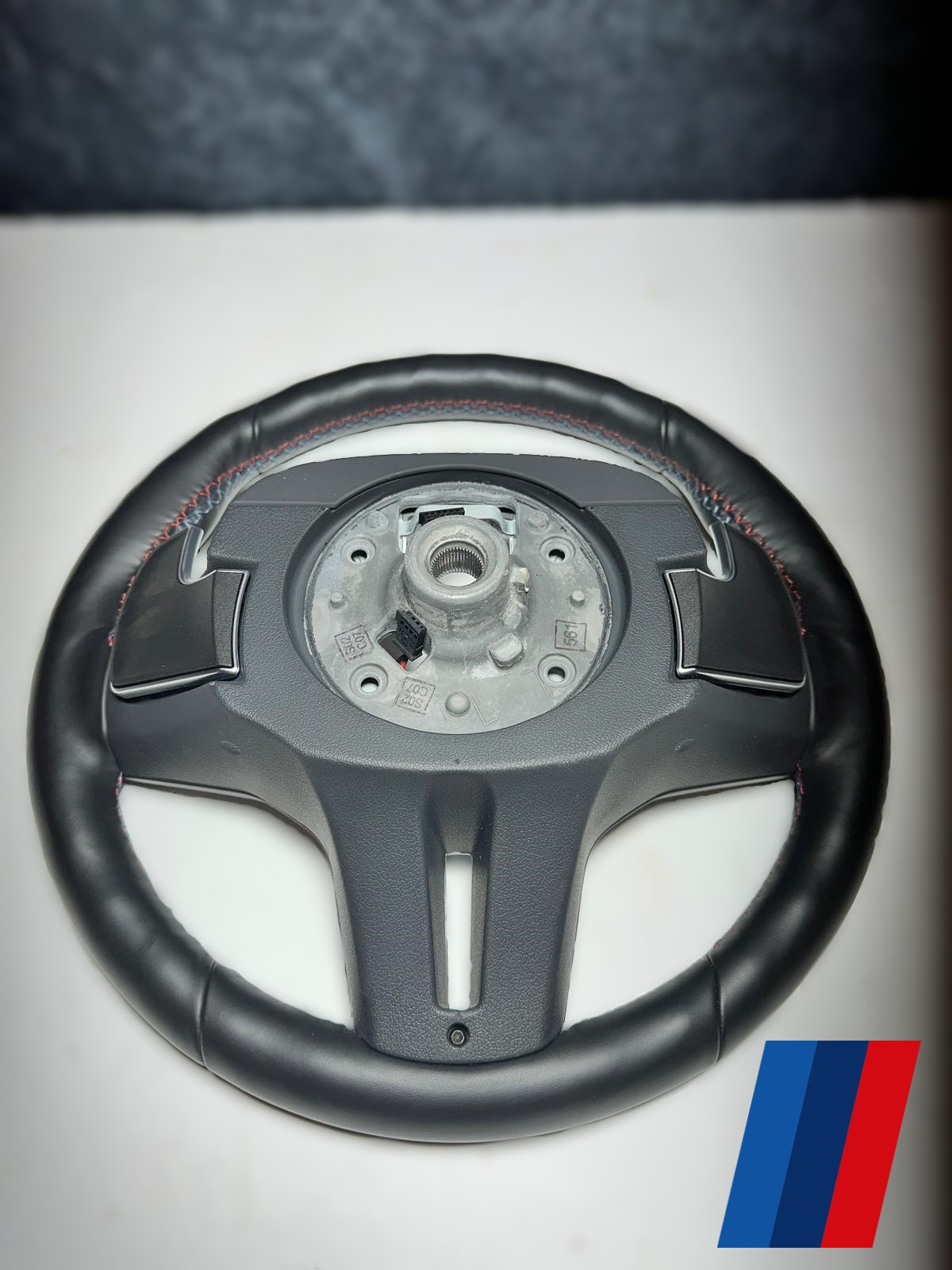 - Material și Design: Îmbrăcat în piele Nappa de înaltă calitate, cu cusături decorative M în culorile clasice (albastru, bleumarin și roșu), volanul oferă o aderență optimă și un aspect sportiv distinctiv.